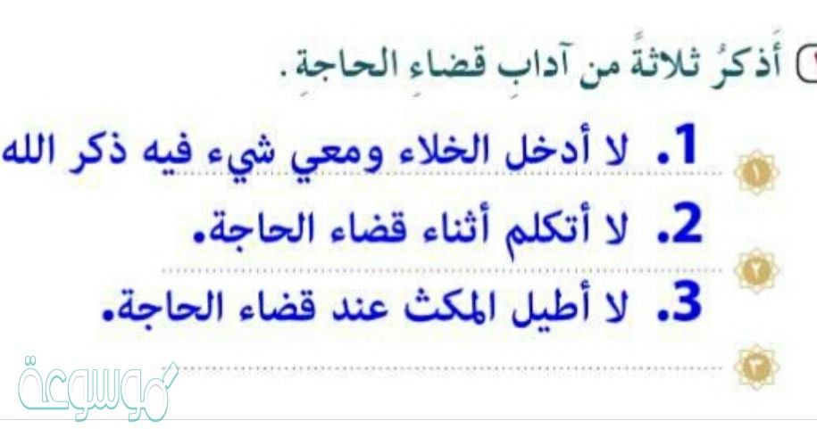 بين الفقه الإسلامي العديد من الأحكام التي يجب على المُسلم أنّ يتبعها وبيانها بشكل عام خصوصًا في توضيح المسائل الدينيّة والالتزام بالعمل الحلال والبعد عن المُحرمات في حياة المُسلم، كذلك بينت لنا السنة النبويّة آداب الدخول إلى الخلاء من أجل قضاء الحاجة وهذه من السنن التي كان النبي مُحمد صلى الله عليه وسلم يتبعها في حياته، ومن أبرز هذه الآداب هي الاستتار وكذلك بيان اجتناب قضاء الحاجة في طرق النّاس وعند الدخول بالرجل اليُسرى وأنّ يُردد الشخص الدعاء بقوله أعوذ بالله من الخبث والخبائث، وأيضًا يجب استخدام اليد اليُسرى في عمليّة الاستنجاء، وأما بالنسبة لحلّ السؤال الذي يُبين أذكر ثلاثة من آداب قضاء الحاجة.