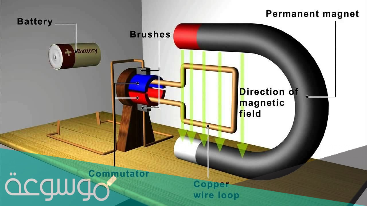 - يوجد في المحرك الكهربائي ذراع متصل بالعديد من الملفات الموجودة داخل المحرك الكهربائي ومحشور بين مغناطيسين دائمين يتحركان نتيجة لتغيير التيار الكهربائي ذهابًا وإيابًا.