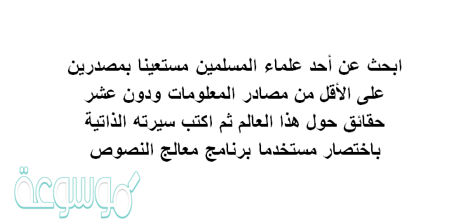 أما عن اجابة سؤال ابحث عن أحد علماء المسلمين مستعينا بمصدرين على الأقل من مصادر المعلومات ودون عشر حقائق حول هذا العالم ثم اكتب سيرته الذاتية باختصار مستخدما برنامج معالج النصوص، في الصورة أدناه:
