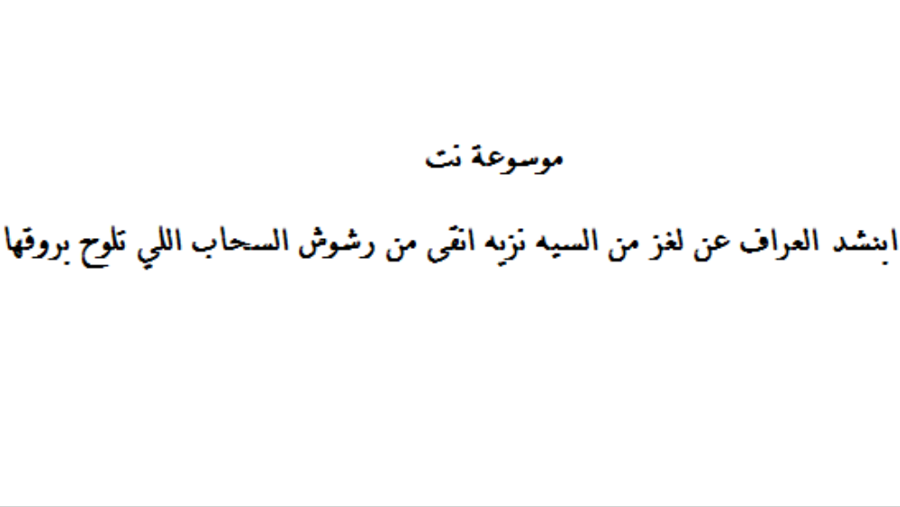 ابنشد العراف عن لغز من السيه نزيه انقى من رشوش السحاب اللي تلوح بروقها، اللغز أصعب ما يمكن للإنسان أن يواجهه وهذا بسبب ما يقوم به هذا اللغز في تزويد الفرد بمعلومات وصفية وتحليلة تعتمد على عدة تحليلات تلزمه أن يقوم بتوفير الحلول الصحيح للمفاهيم الدالة باللغز، حيث أن هذا اللغز يعتبر أكثر الألعاب شهرة بالوطن العربي بسبب أنه تعتبر اللعبة الشعبية الألوى بالنسبة لهم ويمارسها الكثيرين من المواطنين بسبب جماليتها والتأثير الذي تتركه للإنسان تجعله يشعر بالميزة الجديدة والجميلة في تحميس الفرد وتزويده بالعلوم الصحيحة الدالة.