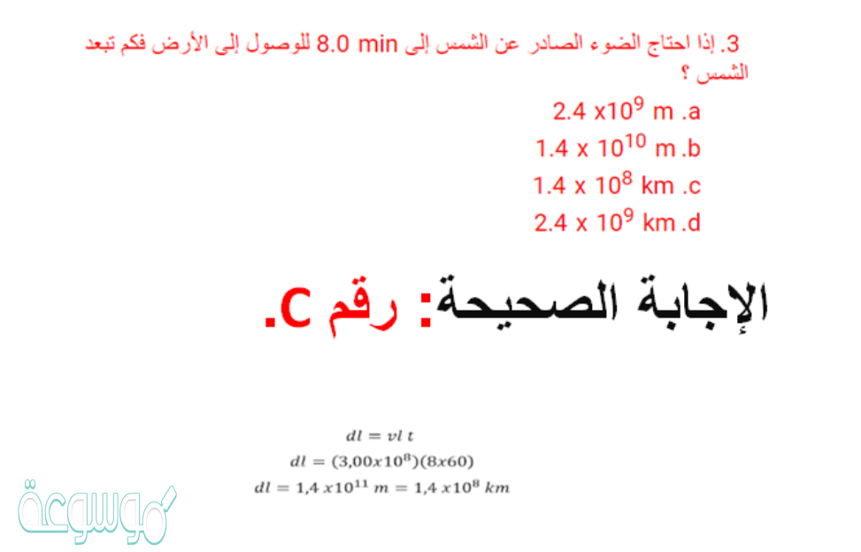 اذا احتاج الضوء الصادر عن الشمس الى 8.0 min