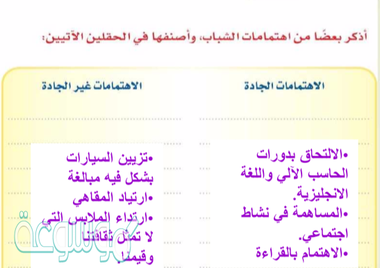 | الاهتمام بالقراءة. | ارتداء الملابس التي لا تمثل ثقافتنا وقيمنا. |