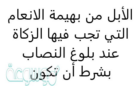 الأبل من بهيمة الانعام التي تجب فيها الزكاة عند بلوغ النصاب بشرط أن تكون، زكاة الأنعام هي زكاة واجبة بالمواشي من نعم، والنعم بالفتح للنون واحد أنعام وهي مال راعية، فجمع الجمع أناعيم، وهو مختص بوجوب زكاة نعم بأجناس ثلاثة وهي: بقر وإبل وغنم، والأجناس الثلاثة هي شاملة عربية وغيرها، فغير واجبة زكاة بالظباء، ومشترطة بوجوب زكاة نعم بأن تكون سائمة فعند الجمهور عكس للمالكية فالسوم هو رعي بكلئ مباح كرعيها من مرعى مسبل أو موقوف أو أذن مالكه برعي فيه، أما إذا مالكها علفها بإنفاقه من ماله عليها غير واجبة الزكاة، فأن يحول عليها بحول وهو بمرور عام كامل، وتبلغ نصابها.