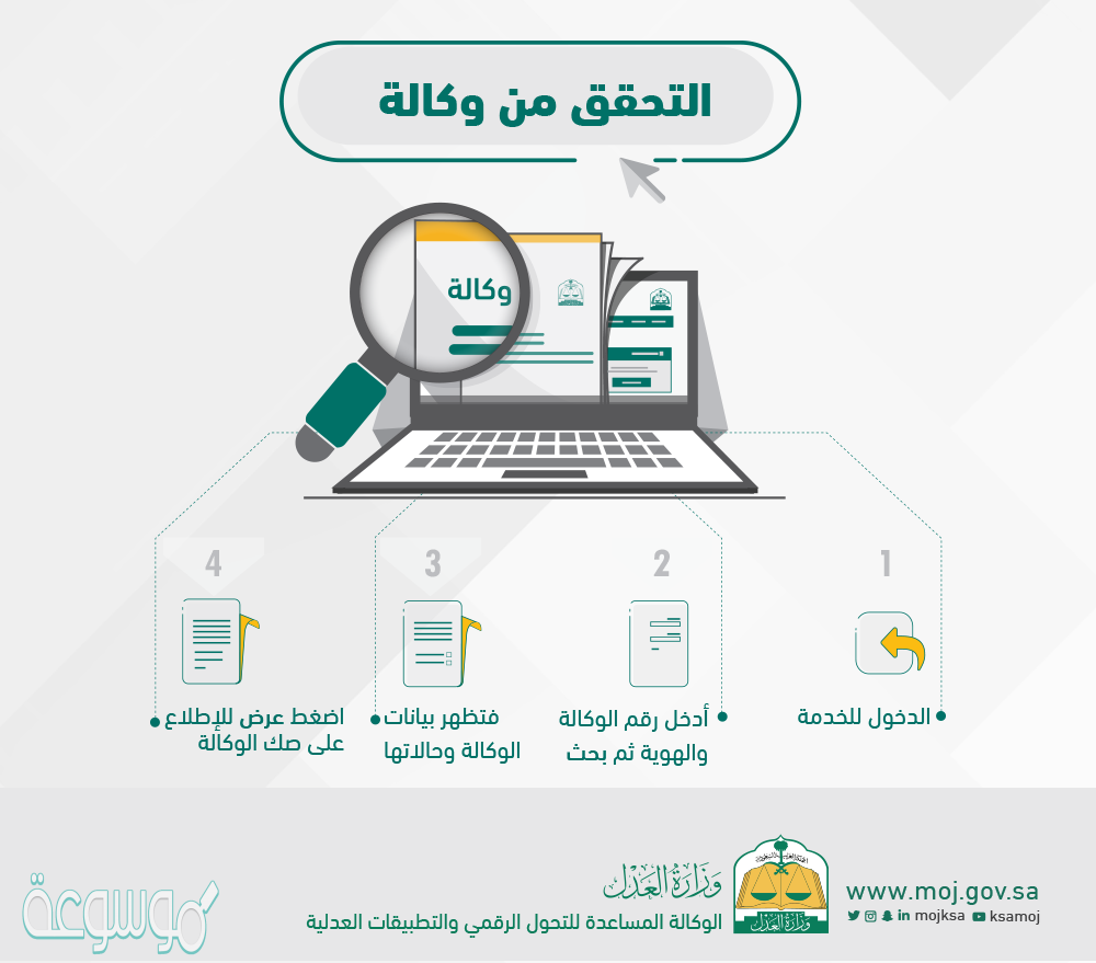 هي إحدى الوزارات المتواجدة داخل المملكة العربية السعودية والتي ساهمت بشكل كبير في تخطي أزمة فايروس كورونا والحد من انتشارها من خلال إنهاء كافة المعاملات لدى المواطنين السعوديين عن طريق مواقع الانترنت والبوابة الإلكترونية التابعة لها، وقد قام العديد من المواطنين بالسؤال عن التحقق من وكالة بالخطوات والشرح حيث أن وزارة العدل السعودية قدَّمت هذه الخدمة عن طريق الانترنت لأجل إتمام الوكالات المُعلَّقة للأشخاص حتى يتمكنوا من تخليص معاملاتهم ومصالحهم المتوقفة بسبب تأخير تلك الوكالة، وهذا ما أتاحته الوزارة عن طريق البوابة الإلكترونية إلى وزارة العدل في المملكة العربية السعودية.