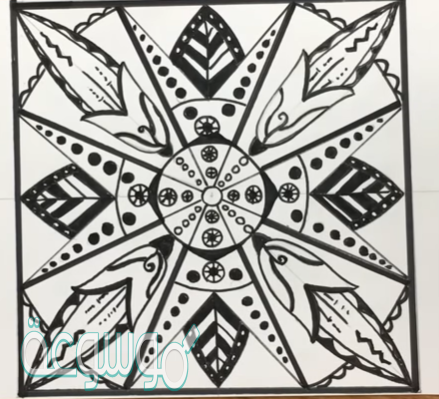 على الخطوط المائلة نقوم برسم دائرة على بُعد 2.5 سم من المركز ، وثم نبدأ برسم اي شكل من اشكال الخطوط ليكن المائل يبدأ من طرف الدائرة حتى نهاية الخط المائل ، مثلا لتشيكل شكل ورقة شجر وغيرها ، نكرر لباقي الخطوط المائلة .