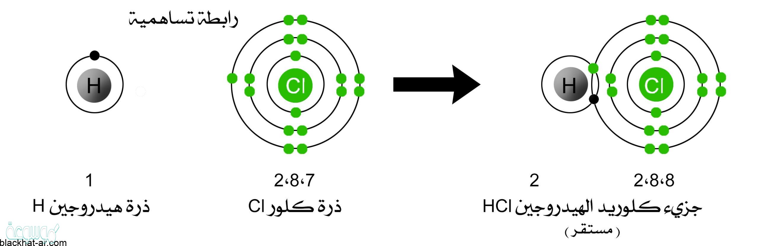 تساهم كل ذرة بإلكترون واحد تشترك الذرتان في زوج من الإلكترونات حتى تصل بمدارها الخارجي إلى ثـمانية إلكترونات فتنعم بالثبات الثماني.
