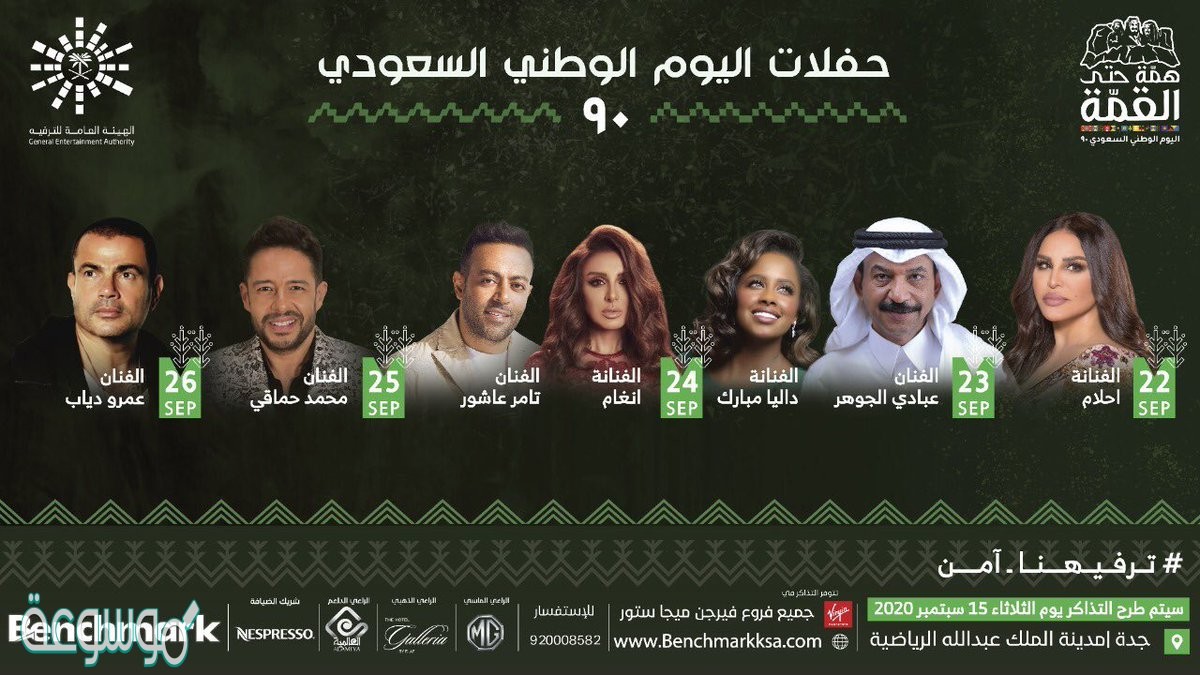 تطل علينا المملكة العربية السعودية بحفلات غاية في الروعة خلال الأيام القادمة، وتحت قيادة نُخبة من الفنانين العرب، حيث أن الحفلات سوف يقودها العديد من الفنانين المحبوبين للجماهير بشكل كبير، وسوف يفتتح حفل اليوم الوطني السعودي الـ90 بقيادة الفنانة العظيمة “أحلام الشامسي” حيث أنها سوف تغني في 22/ سبتمبر داخل مدينة الملك عبد الله الرياضية في جدَّة، وسوف تتوالى الحفلات الرائعة، بقيادة رابح صقر ومحمد حماقي وتامر عاشور وأنغام وعمرو دياب، وراشد الماجد وماجد المهندس وداليا مُبارك وغيرهم من الفنانين الرائعين الذين سوف يقفون على منصَّات الحفلات للاحتفال مع الجماهير، كما أن تذاكر الحفلات لهذا العام تتراوح ما بين 300 إلى 2300 ريال سعودي، على حسب المكان المُراد الجلوس فيه داخل الحفل.