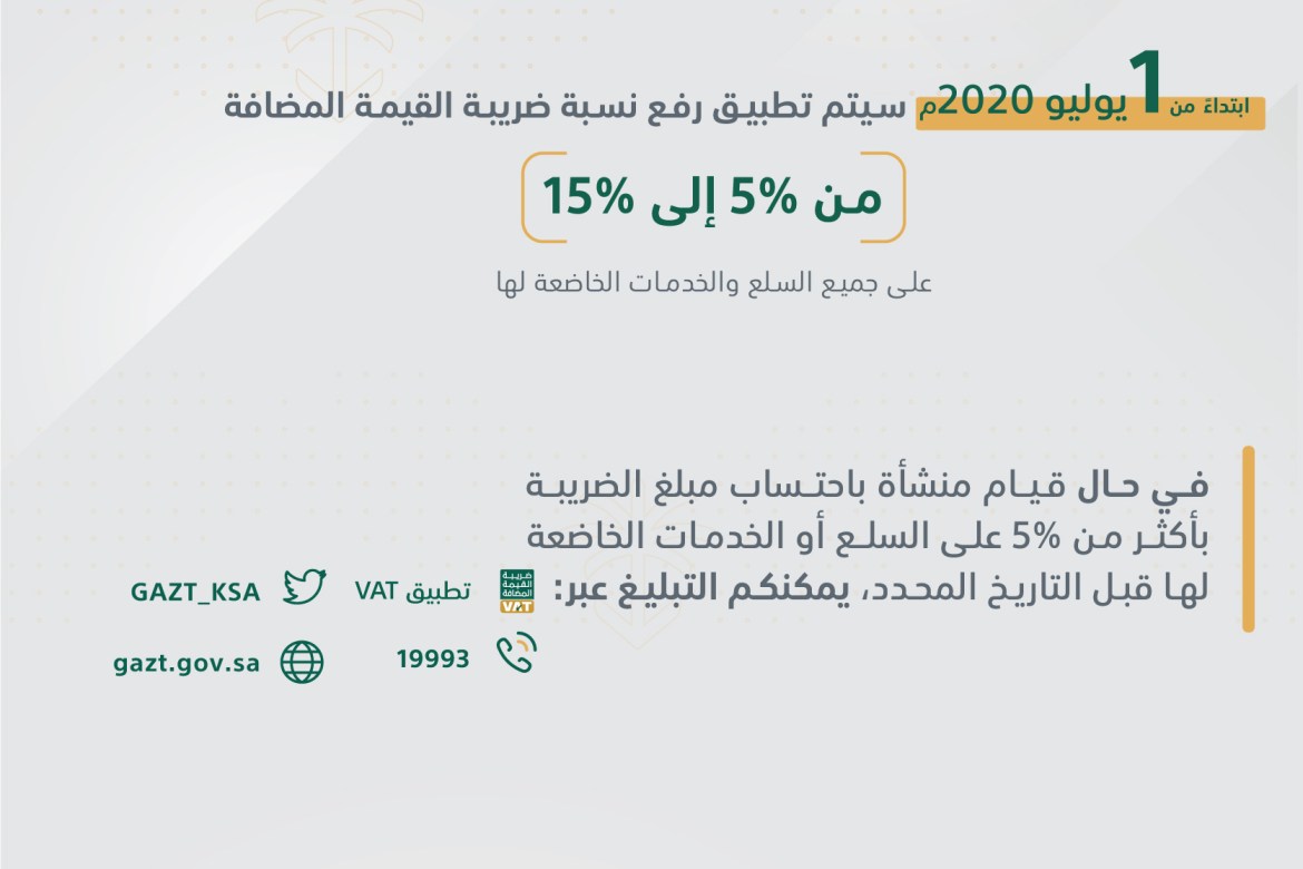 والجدير بالذكر أن ضريبة القيمة المُضافة قد ارتفعت من 5% إلى 15% وقد عرضنا لكم تفاصيلها كاملة وتاريخ بدأ العمل فيها ميلادياً وهجرياً.