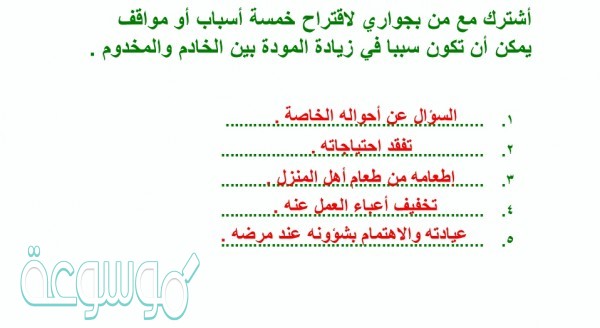 اقترح خمسة أساليب أو مواقف يمكن أن تكون سبباً في زيادة المودة بين الخادم والمخدوم، يعتبر هذا السؤال من أسئلة كتاب لغتي الخالدة للصف الأول المتوسط الفصل الدراسي الأول، فان الخادم والمخدوم هناك الكثير من الطرق التي تساهم في زيادة المودة والمحبة بينهم، وعدم إقتصارها على الأمور الرسمية الخاصة بالعمل، ومن هنا فإن الكثير من المخدومين يسعون لزرع بذور الثقة والمحبة مع الخادمين من خلال العديد من المواقف أو الاساليب، وفي مقالنا هذا سوف نتعرف على خمسة من اساليب او مواقف يمكن ان تكون سببا في زيادة المودة بين الخادم والمخدوم.