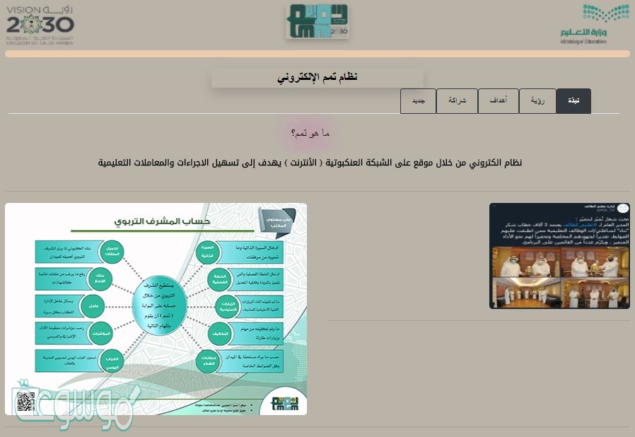 برنامج تمم للتعليم الإلكتروني هو عبارة عن برنامج إلكتروني مهم يضمن لدى الوزارة تسهيل المعاملات المالية التي يسعى لها الطالب في ظل سعيه من أجل الحصول على الخدمات الإلكتروني السريع من خلال البوابة، حيث أن هذه المنصة من ضمن المنصات التابعة لوزارة التربية والتعليم والتي تسعى من أجل الطالب وعرض عليه كل المعلومات الجديدة التي تخصه من خلال الدخول إلىالبوابة ومشاهدة كل جديد ومن أهداف البرنامج.