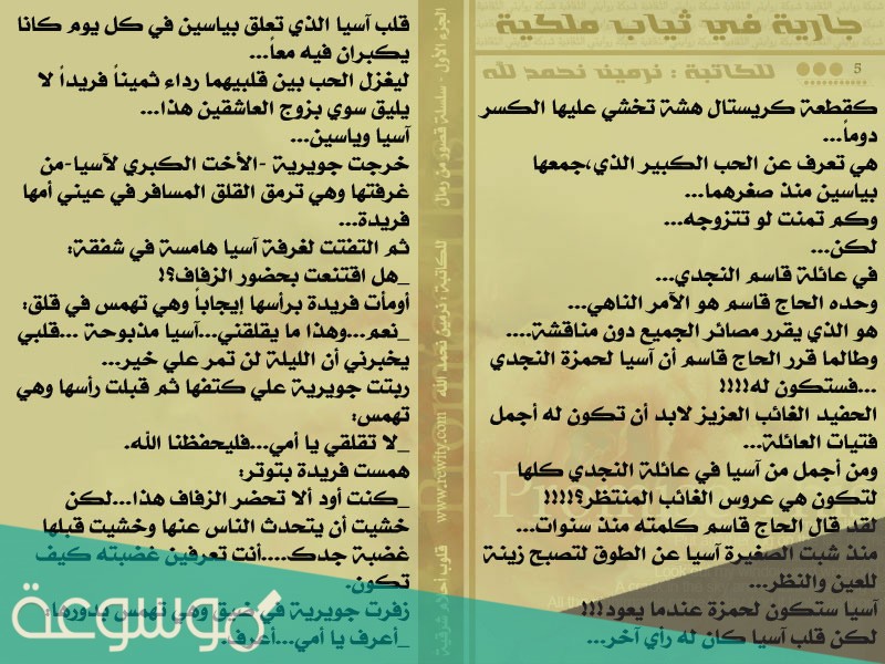 رواية جارية فى ثياب ملكية pdf، تبهرنا الروايات بقصصها بشكل مستمر سواء في الروايات العربية او الاجنبية العالمي او حتى في الروايات المحلية والعالمي، الرواية أحد أهم فئات الأدب وأصعبها حيث يقوم الكاتب بكتابة أحداث مهمة أما واقعية او خيالية وهنا نتحدث عن نرمين نحمد الله الفتاة الشابة التي تبهرنا دائما بكتابتها دعونا نتعرف على رواية جارية فى ثياب ملكية pdf واهم الاحداث التي دارت في الرواية.