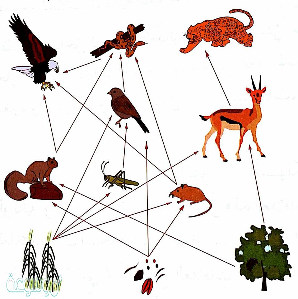 - اعشاب، حشرة، فأر، افعى، صقر.