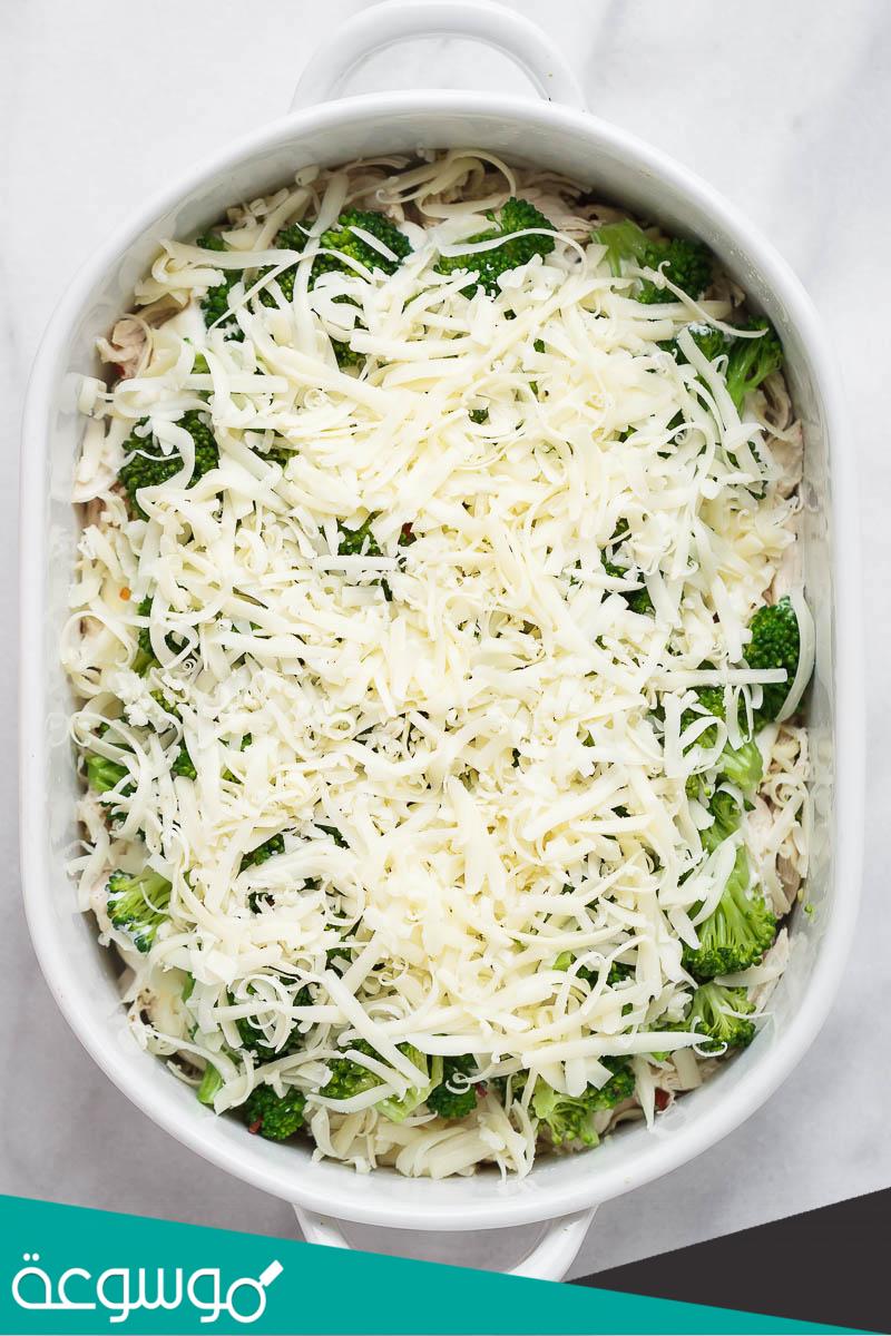 - ضعي طبقة من البروكلي ثم جبن الموزاريلا في الكسرولة.
