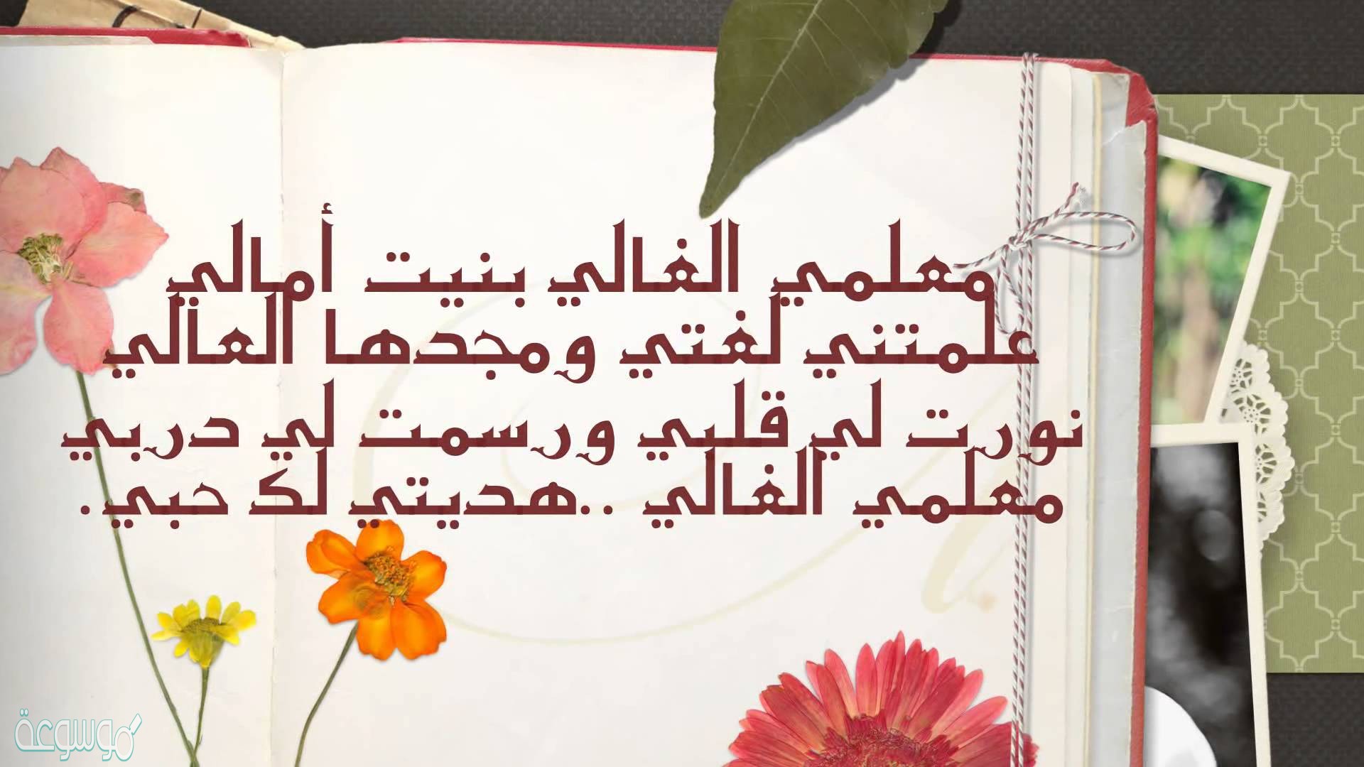 مُعَلِّمِي أَنْت الشَّجَرَةِ الَّتِي نَسْتَظِلّ بِظِلِّهَا وَنَأْكُل مِنْ ثَمَرِهَا فنزداد بِهَا عِلْمًا ونرفع بِهَا مَكَانَه وَأَنْت الزَّهْر الَّذِي يَنْبُتُ فِي قُلُوبِنَا فيرويها علماً بَعْد عَطَّشَهَا وَيُنْبِت فِي عُقُولِنَا ونسيطر تِلْكَ الْكَلِمَاتِ الَّتِي لَا تَلْبَث بِالْوُقُوف إِمَامِكُم مِنْ رَهْبَةٍ الْمَوْقِفِ وَشِدِّتِهِ فلولاكم مَا نَبَتَ وَلَا ثَبَتَ وَلَا كَتَبْنَا حرفاً واحداً إلَّا انْفَلَت .
