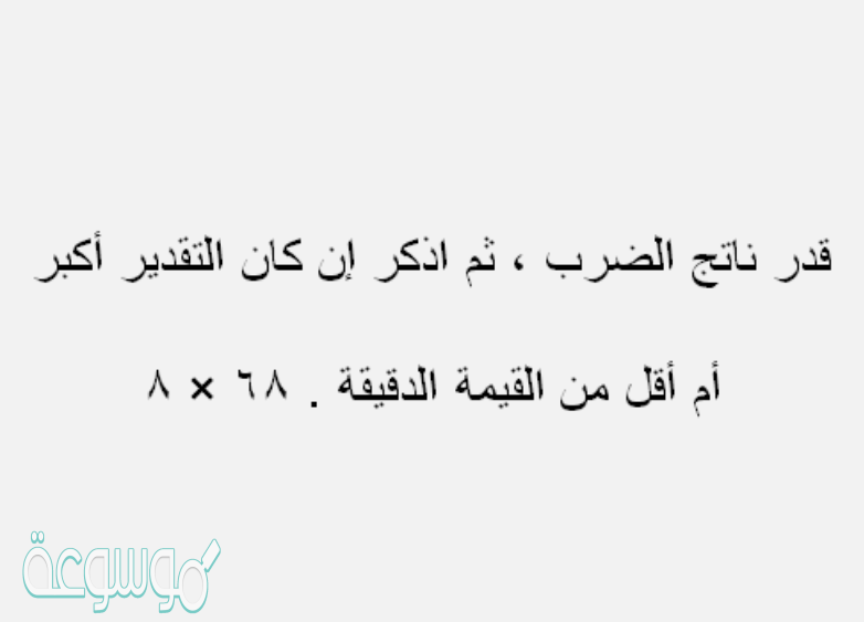 قدر ناتج الضرب ثم اذكر إن كان التقدير أكبر أم أقل من القيمة الدقيقة ٦٨ × ٨