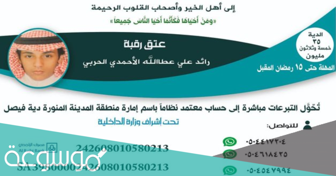 قصة رائد علي عطالله الاحمدي هي القتل في الصغر عندما وقع خلاف بينه وبين القتيل دفع ثمنها السجن 9 سنوات ومبلغ الدية الذي يقع على المواطن هو دفع 35 مليون ريال قال تعالى في كتابه الكريم ” وَمَا كَانَ لِمُؤْمِنٍ أَنْ يَقْتُلَ مُؤْمِنًا إلَّا خَطَأً وَمَنْ قَتَلَ مُؤْمِنًا خَطَأً فَتَحْرِيرُ رَقَبَةٍ مُؤْمِنَةً وَدِيَةٌ مُسَلَّمَةٌ إلَى أَهْلِهِ إلَّا أَنْ يُصَدِّقُوا فَإِنْ كَانَ مِنْ قَوْمٍ عَدُوٍّ لَكُمْ وَهُوَ مُؤْمِنٌ فَتَحْرِيرُ رَقَبَةٍ مُؤْمِنَةً “.