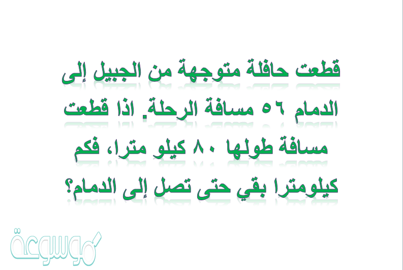 تميزت مادة الرياضيات في تعزيز الكثير من المجالات المُتنوعة في حياة الإنسان خصوصًا أنها حظيت بمجموعة من التغيرات العلميّة التي ارتبطت في عدّة من الفروع والدراسات التي ساعدت على تحديد التكامل الخاص بها، أيضًا تميزت هذه بكونها من هم المواد التي عززت المهارات الحسابيّة والقوانين العلميّة بشكل جيّد، وتحظى هذه المادة بأهميّة علميّة كونها تداخلت في علم الفيزياء والكيمياء بشكل عام، وسنوضح لكم حلّ المعادلة التي تُبين قطعت حافلة متوجهة من الجبيل إلى الدمام ٥٦ مسافة الرحلة. اذا قطعت مسافة طولها ٨٠ كيلو مترا، فكم كيلومترا بقي حتى تصل إلى الدمام.