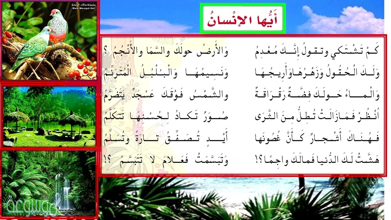كلمات أنشودة أيها الإنسان الصف الخامس، تعتبر الأناشيد من أهم الفنون التي تساعد على الحفظ بسرعة خاصة لدى الأطفال، وقد اخذت الأناشيد طابعاً منهجياً من خلال إدخالها الى كتب الأطفال وكتب المرحلة الابتدائية، وقد تم ادخال هذه الأناشيد الى الكتب المنهجية بطريقة هادفة ومفيدة لتحقيق الفوائد التربوية المرجوة، كما ان الأناشيد تعمل على تحسين النطق وإخراج الحروف من مخارجها بوضوح اثناء الانشاد، وتعتبر انشودة أيها الانسان أحد الأناشيد التي لحنها الشاعر إيليا أبو ماضي، وهو من أشهر شعراء أدب المهجر.