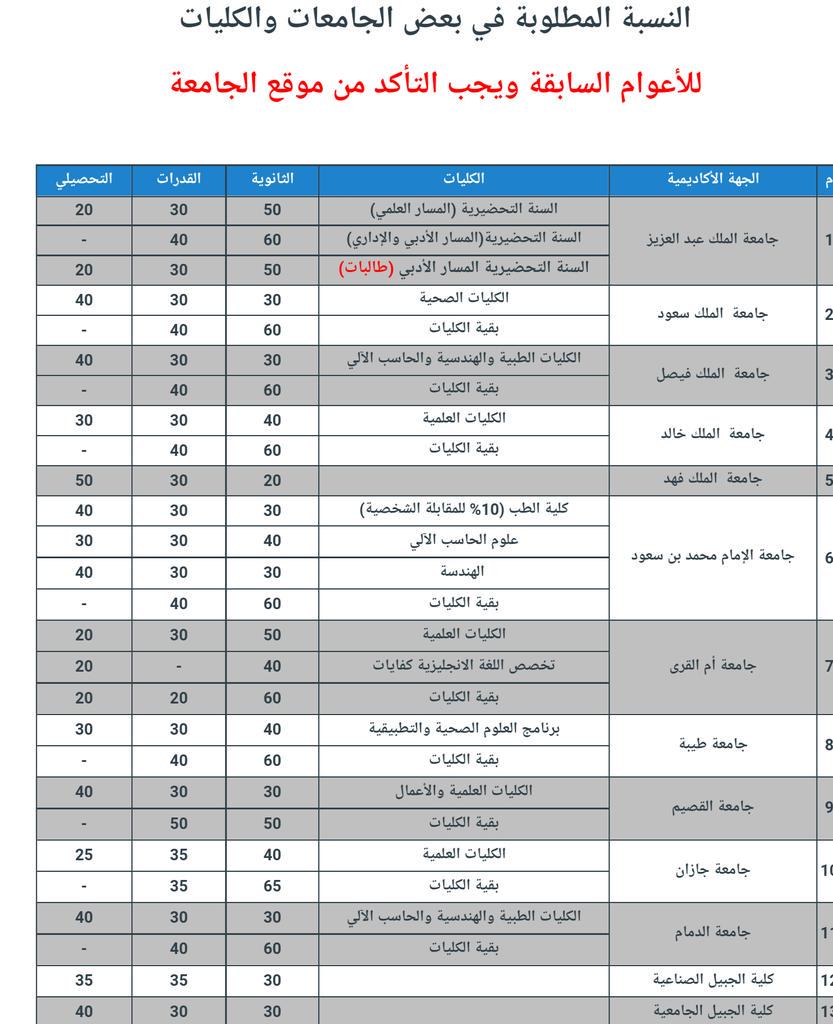 - جامعة الملك عبد العزيز: النسب الموزون لتخصصات العلمية (50% ثانوية+ 30% قدرات+ 20% تحصيلي) أما التخصصات الادارية(50% ثانوية+ 30% قدرات+ 20% تحصيلي).