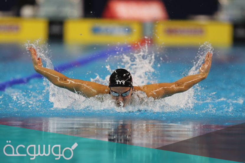 - سباحة الفراشة: يقوم السباح بتحريك ذراعيه إلى الأمام وفوق الماء، ثم يدفعهما إلى الخلف ويعيد الحركة بشكل متواصل، سباقات سباحة الفراشة كذلك 100، 200، و50م.