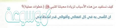 كيف نستفيد من هذه الاسباب لزياده محبتنا للنبي؟ الاجابة الصحيحة/ أن اتاسى به في كل افعالى واقوالي قدر الاستطاعة.