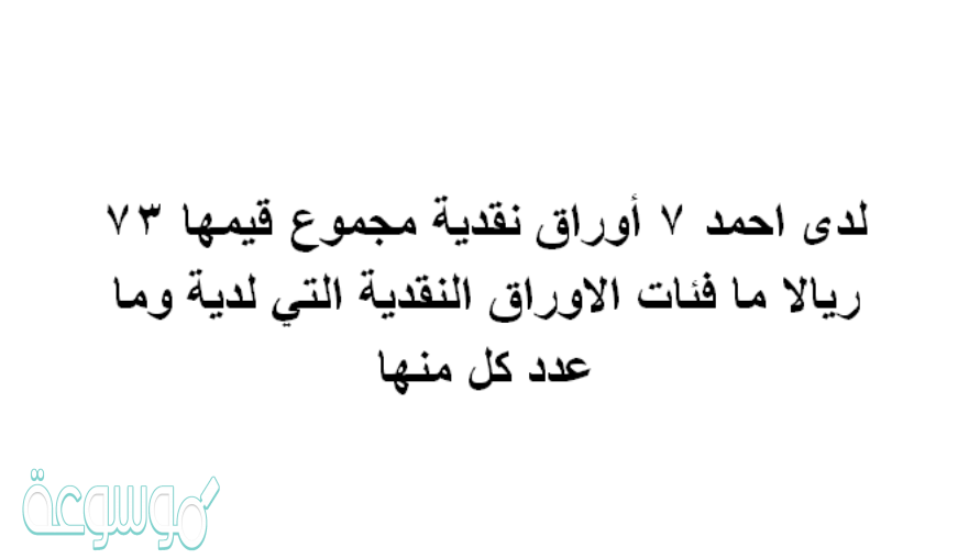 س/ لدى احمد 7 أوراق نقدية مجموع قيمها 73 ريال ما فئات الأوراق النقدية ؟