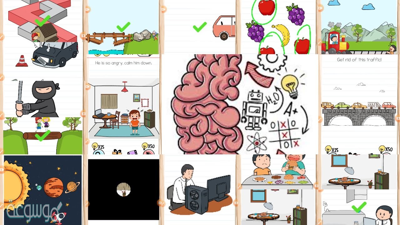 - لعبة Brain Test المستوى 240: الحل هو ” اهبط للأسفل خطوة واحدة، تحرك 3 خطوات لليمين، من ثم خطوتين للأسفل، من ثم خطوتين لليسار، من ثم خطوتين للأسفل، من ثم خطوتين لليمين”.