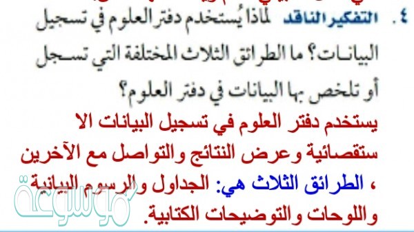 • حلّ السؤال: يستخدم دفتر العلوم في تسجيل البيانات الاستقصائية وعرض النتائج والتواصل مع الآخرين الطرق الثلاث هي الجداول والرسوم البيانية واللوحات والتوضيحات الكتابية.