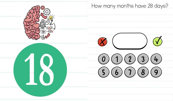 في لعبة (Brain test) الشهيرة والذي تطرح الألغاز للمُستخدمين منها المُضحِكة ومنها الصعبة جداً، فتحتاج للارتخاء والتركيز بشكل كبير حتى تستطيع الحل، وفي المرحلة الثامنة عشر تطرح اللعبة سؤالها الشهير (ما هو عدد الأشهر التي تحتوي على 28 يوم) والعديد من اللاعبين لم يستطيعوا حل السؤال، رغم بساطته لكنه يحتاج للتركيز والتدقيق في إمكانية حله، مما أحدث ضجة واختلفت الآراء بين الناس على صِحة السؤال من عدمه بسبب إجابته، وانقسم جمهور اللعبة ما بين مؤيد لذكاء السؤال وحله ومُعارِض لأن الحل ليس هكذا.