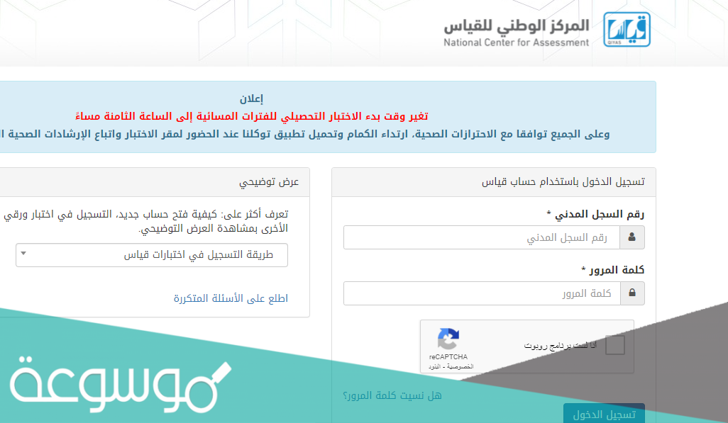 اعلن المركز الوطني عن وجود تغير في وقت بدء الاختبار التحصيلي للفترات المسائية ستكون في الساعة الثامنة مساءاً، نوه المركز على أهمية الالتزام بالإجراءات الاحترازية بارتداء الكمام وتحميل تطبيق توكلان قبل الحضور لمقر الاختبار ومتابعة إجراء وزارة الصحة السعودية.