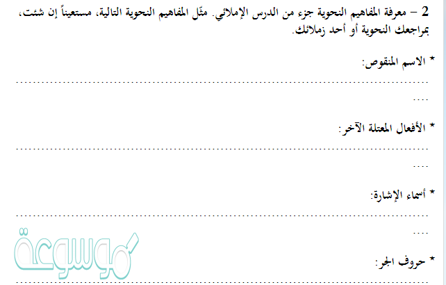 معرفة المفاهيم النحوية جزء من الدرس الإملائي، ومثّل المفاهيم النحوية التالية بمراجعك النحوية