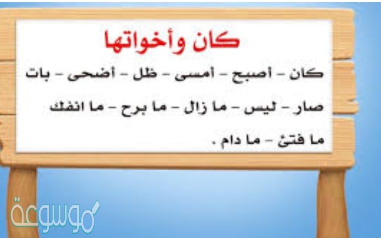 - كان وأخواتها: ” كان، أصبح، ظل، بات، صار، أمسى، ليس، زال، برح، فتئ، انفك، فتئ، دام”.