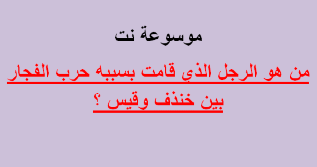 من هو الرجل الذي قامت بسببه حرب الفجار بين خنذف وقيس ؟، يعتبر هذا اللغز من ضمن الألغاز الجميلة والذي تأتي في الألعاب بكثرة فهي من الألغاز الأكثر حداثة بالوطن العربي والذي تعمل باستمرار من أجل راحة اللاعبين الذين يسعون من أجل رؤية المتعة، وهذا اللغز من ضمن الألغاز الجميلة الذي يبحث عنها الإنسان من خلال رؤيتها في الألعاب الجديد الذي تعتبر من ضمن الأبرز بالألعاب الذي يحصل على الفرد في الوصول إلى الحلول الجميلة الذي لها تأثير على الفرد الذي يجب عليه امتلاك المعرفة والجمال في الحياة.