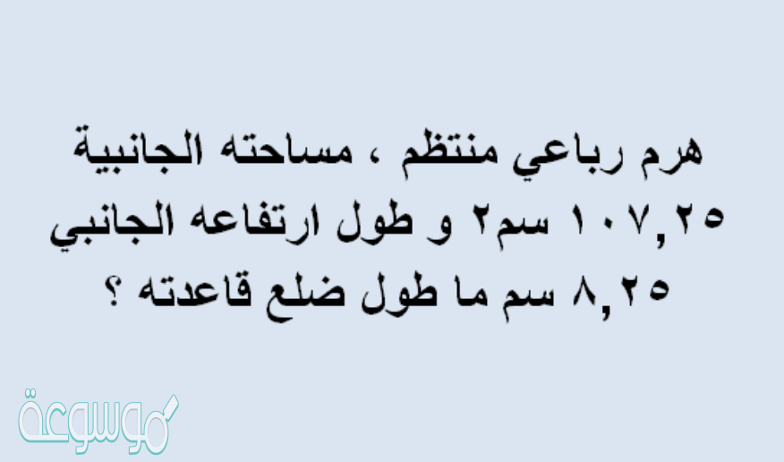 هرم رباعي منتظم ، مساحته الجانبية 107,25 سم2 ، و طول ارتفاعه الجانبي 8,25 سم ، ما طول ضلع قاعدته ؟، كتاب الرياضيات احد الكتب الدراسية الصعبة والمهمة بنفس الوقت للطالب الذي يريد السعي خلف النجاح والتفوق في حياته الدراسية، لان كتاب الرياضيات يقوم على عدة محاور هامة منها تعليم الطالب كيفية القيام بالعمليات الحسابية في حياته اليومية، كما أنها تنشط عقل الفرد وتنمي الذكاء للابتكار والتجديد ومع الوقت يصبح الطالب أكثر حكمة وعقلانية فهو علم مبني على المنطق والبرهان لذلك يعد جزء من حياة الإنسان التي بنيت على المنطق.