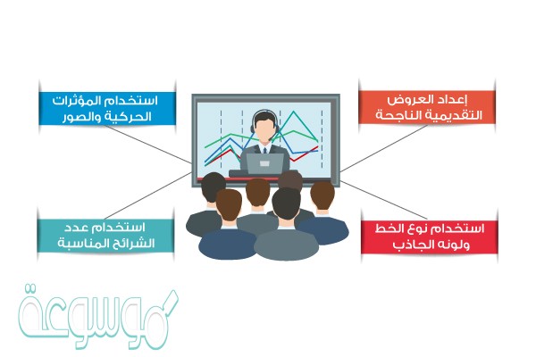 إذ من المهم الالتزام بمواصفات العرض التقديمي الجيد التي ذكرناها مسبقا للحصول على عرض تقديمي ناجح، وذلك من خلال اشتمال العرض التقديمي على أهم المعلومات المتعلقة بموضوع العرض، واستخدام عدد الشرائح المناسبة بدون أي نقص في المحتوى المعروض، واستخدام نوع الخط مناسب ولون الجاذب يتناسب مع ألوان الخلفية، واستخدام المؤثرات الحركية والصور التي تسهم في توضيح المحتوى بشكل ملفت ومشوف، وبعيد عن الجمود مع الاهتمام بالأسلوب العلمي لطريقة العرض.