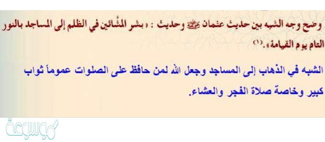 - الشبه في الذهاب إلى المساجد وجعل الله لمن حافظ على الصلوات عمومًا ثوابًا كبيرًا وخاصة صلاتي الفجر والعشاء.
