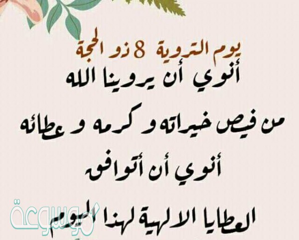 يوم التروية يقوم الحجاج في هذا اليوم بالتجمع للاستعداد إلى الذهاب إلى منطقة منى حتى يؤدوا الركن الأهم في الحج وهو الوقوف بجبل عرفات ، حيث يذهبوا إلى منى فجر يوم عرفة استعداد ليوم النحر باليوم التالي وهو اليوم العاشر من ذي الحجة يوم عيد الاضحى المبارك الذي يقوم المسلمون فيه بذبح الاضحية تقرب إلى الله ، ادعية يوم التروية للحاج وغير الحاج ، ذكرت السنة النبوية وعلمنا شفيعنا محمد صلى الله عليه وسلم ما نقول في هذا اليوم وهناك العديد من الأدعية المذكورة والوارد الصحيحة بفضل هذا اليوم ويستحب فيه التلبية فيردد المسلمون “لبيك اللهم لبيك لا شريك لك لبيك إن الحمد والنعمة لك والملك لا شريك لك، ويستحب في هذا اليوم التكبير بقول ” الله أكبر الله أكبر الله أكبر لا إله إلا الله ، الله أكبر الله أكبر ولله الحمد”.